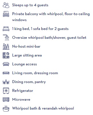 The suite has three separate areas: the bedroom, the living room, and the dining room. You have a guest half-bathroom near the entry. There's also a pantry (with its own separate hallway door, so that your steward can replenish supplies without disturbing you) with a fridge, coffee maker, and microwave.