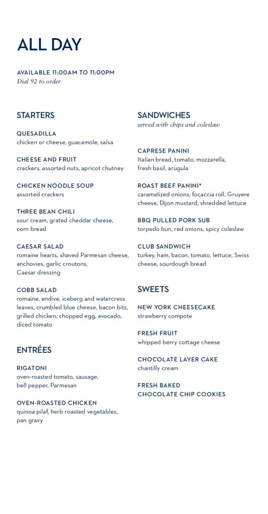 Between 11 AM and 11 PM, you can order from the All Day Room Service menu. You can get such things as a quesadilla, soup, chili, a salad, pasta, roast chicken, a sandwich or something sweet.