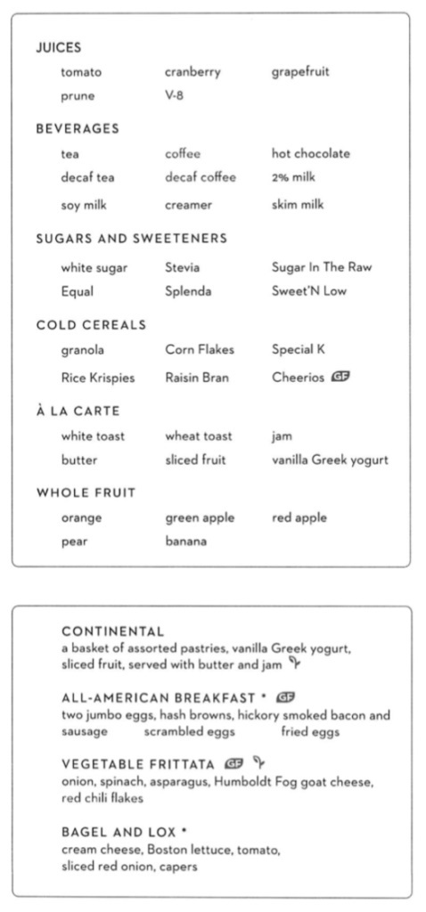 If you aren't sure what time you'll get up, or if it's between 10 AM and 11 AM, or if you don't know what you'll want to eat in the morning, you can simply press 92 when you wake up (as long as it's before 11 AM) and order from the Room Service Breakfast menu.