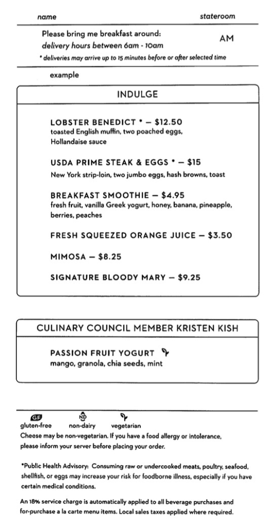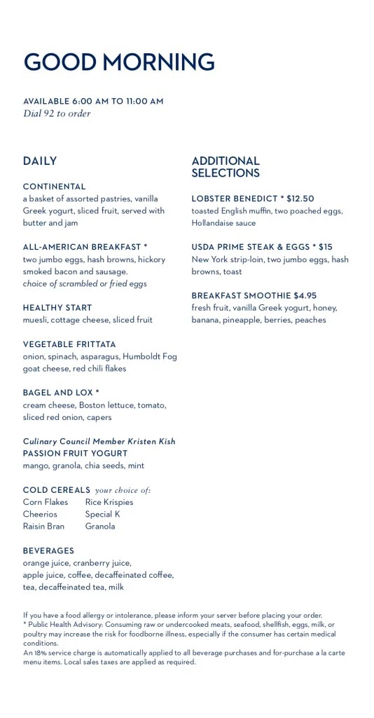 The less-good news is that the Room Service offerings are relatively limited (as they tend to be on all but the super-luxury cruise lines).