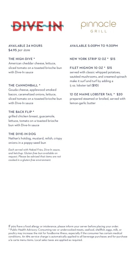There is also a page of the Room Service menu with offerings from Dive In (hamburger, cheese sandwich, chicken sandwich, and hot dog) and the Pinnacle Grill (New York Steak, Filet Mignon Steak, and Lobster Tail). The Pinnacle Grill items are available from 5 PM to 9:30 PM, but the Dive In burgers and other items are available 24-hours a day. The catch is that they all come with an extra cost ($5 for the Dive In items, $15 for the steaks, and $20 for the Lobster)*.