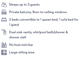 Signature Suites are significantly larger than lower cabin categories, and their verandahs are much roomier. You'll have both a bathtub and a separate shower stall and side-by-side sinks.
