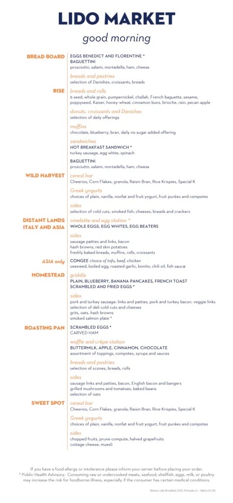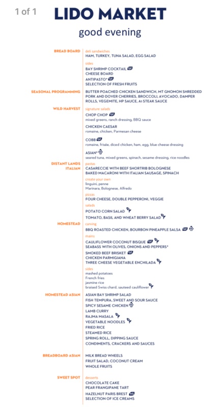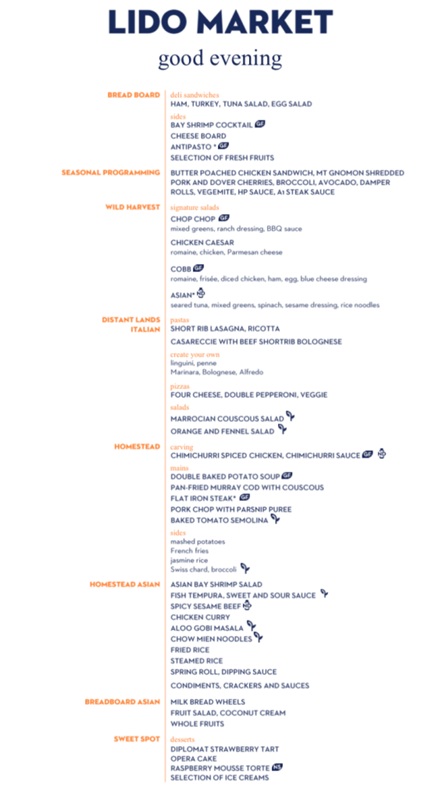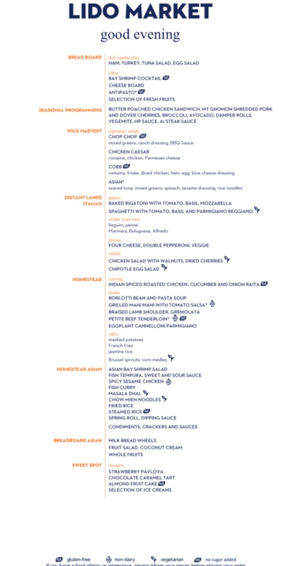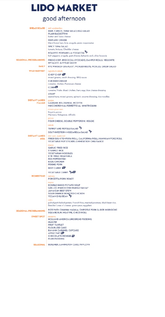 The Lido Market, one of the two principal Nieuw Amsterdam restaurants (the other is The Dining Room) included in your cruise fare, serves Breakfast, Lunch, and Dinner in a buffet format.