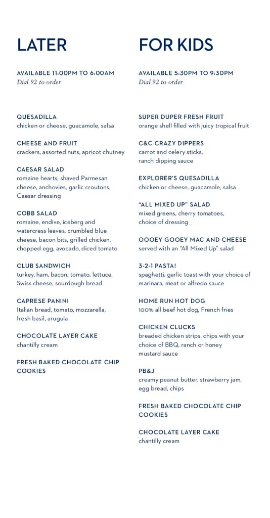 The less-good news is that the Room Service offerings are relatively limited (as they tend to be on all but the super-luxury cruise lines).