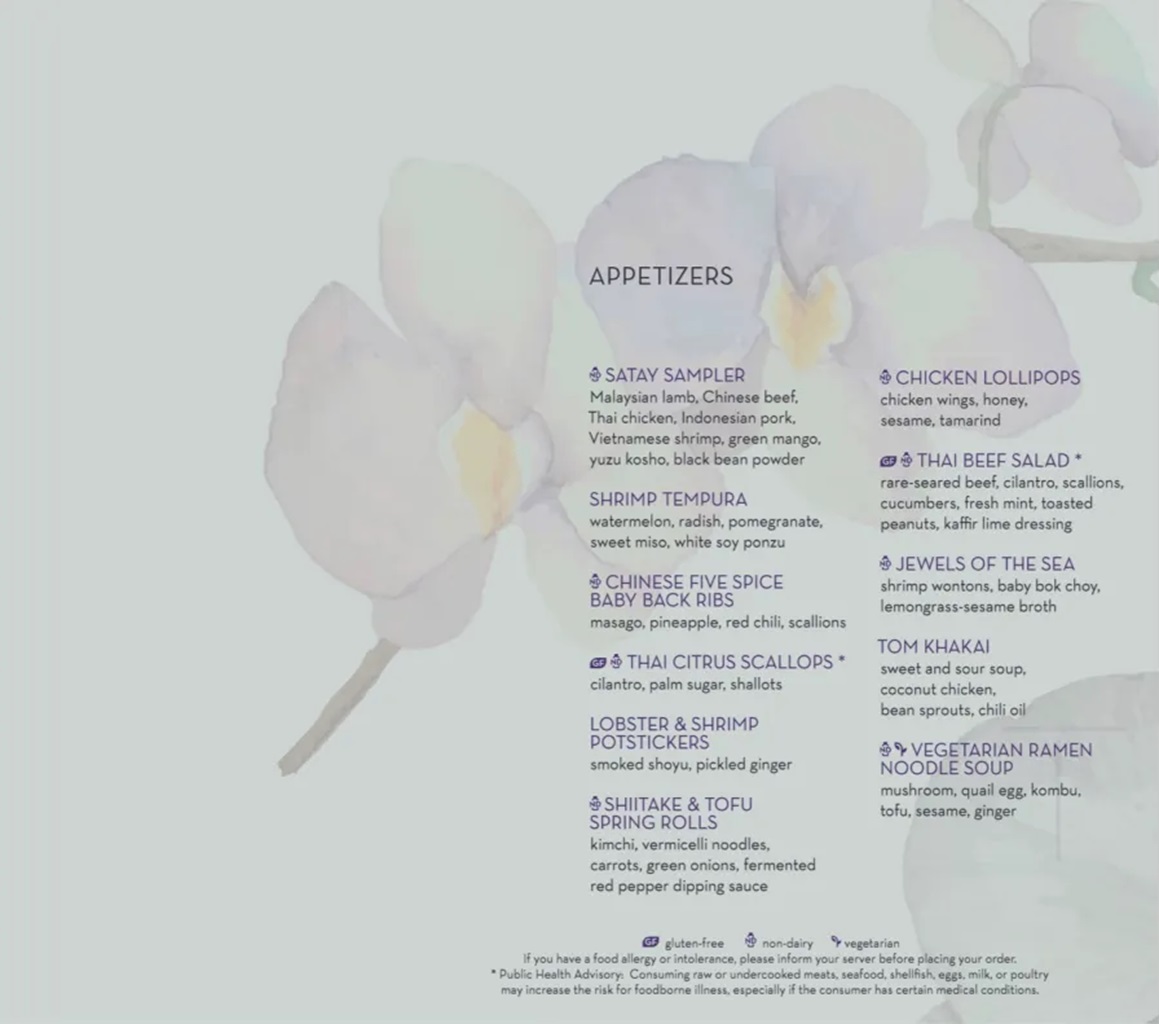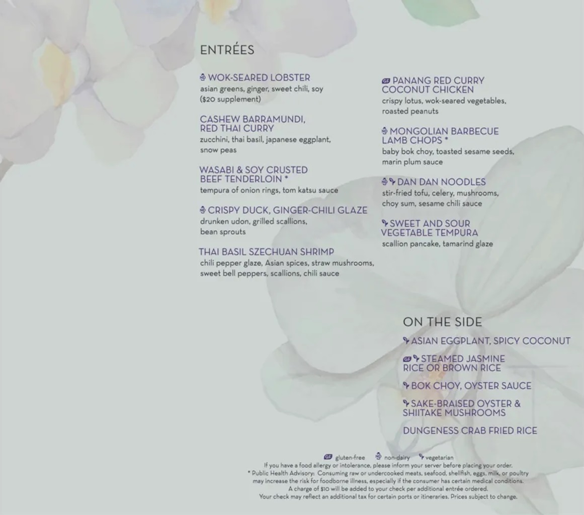 Tamarind (midships starboard side Deck 11 - Observation Deck) is Holland America's Asian Fusion cuisine specialty restaurant. As a specialty restaurant, there is an additional cost associated with it. One item on the menu (Wok-Seared Lobster) carries a supplemental charge.